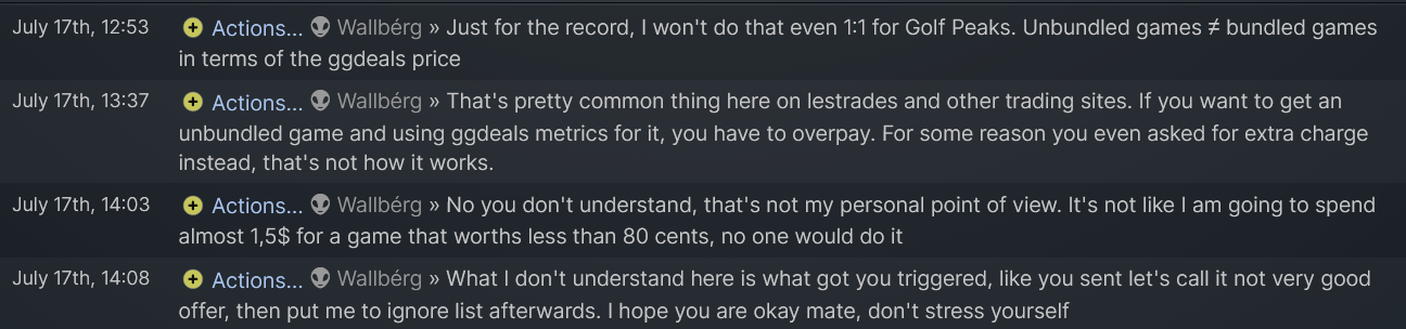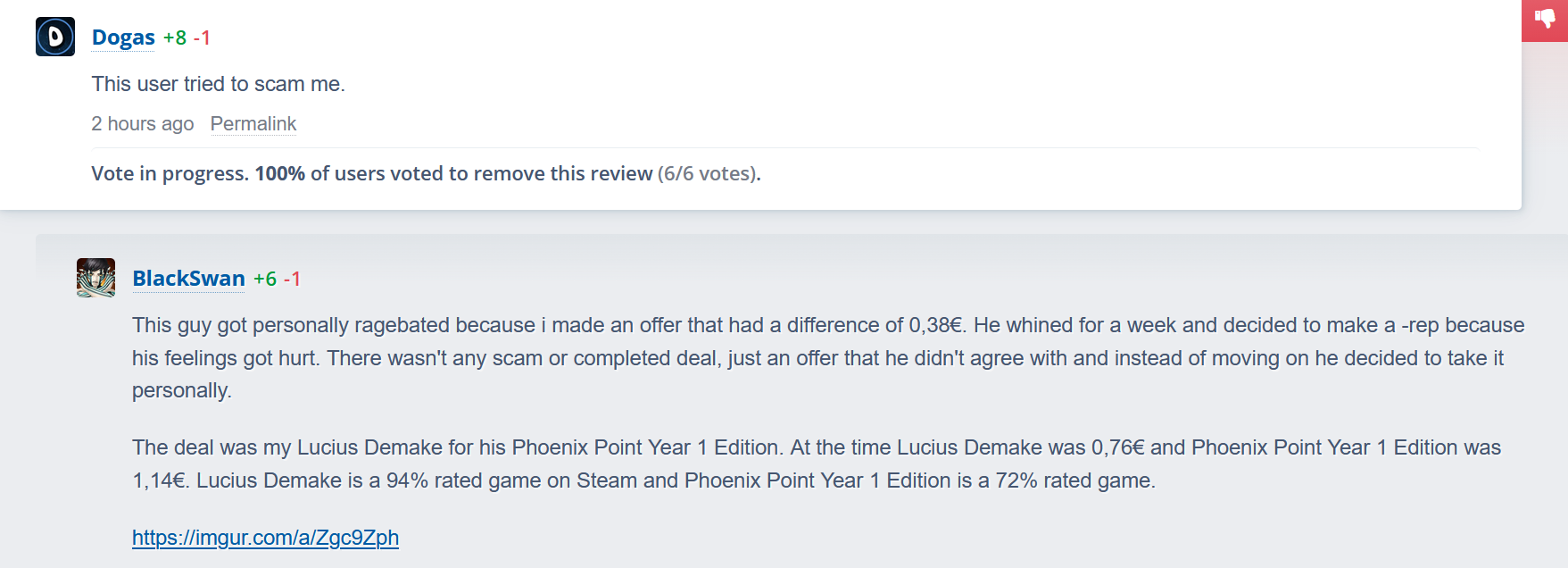 This guy -reps on people whose offer he doesn't like. I made on offer with a difference of 0,38€ according to gg.deals at that time and he took it personally and whined for a week instead of rejecting my offer and moving on. He didn't bother checking the prices on gg.deals, he just referred to the outdated prices on Lestrade's and called my offer a scam. Lestrades prices are not real time and get updated every once in a while.
