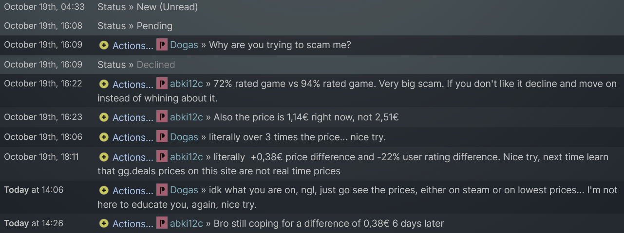 Edit: Now he edited his comment to make it sound like he's sorry about it. He also reposted the conversation that once again shows todays prices with Phoenix Point having an outdated price even now that it's 2,12€ instead of ~10€ more. Everybody can double check the price history on gg.deals and will find out that on October 19th when i sent the offer, the minimum price for Phoenix point was 1€ (at the time i sent the offer it was 1,14€).